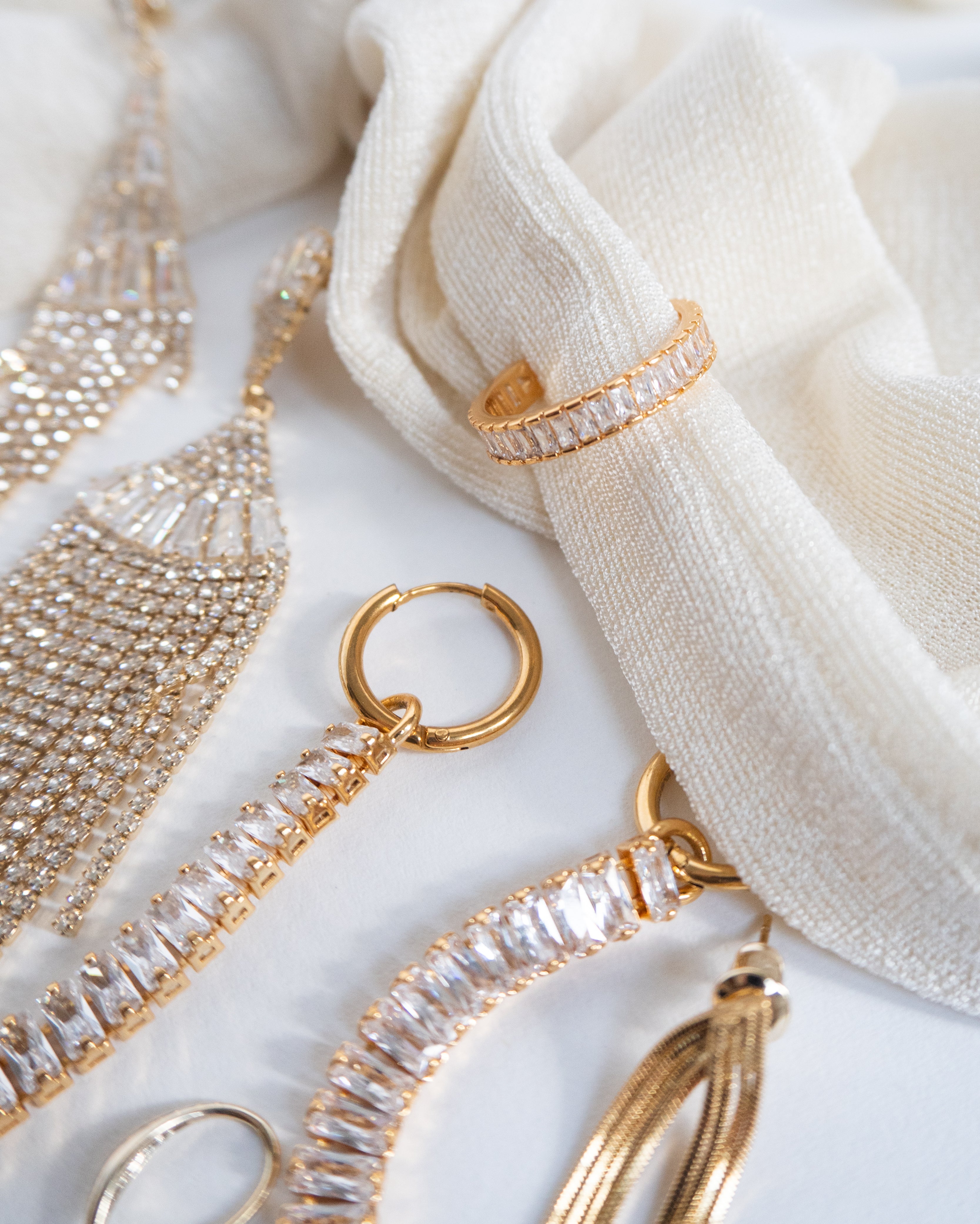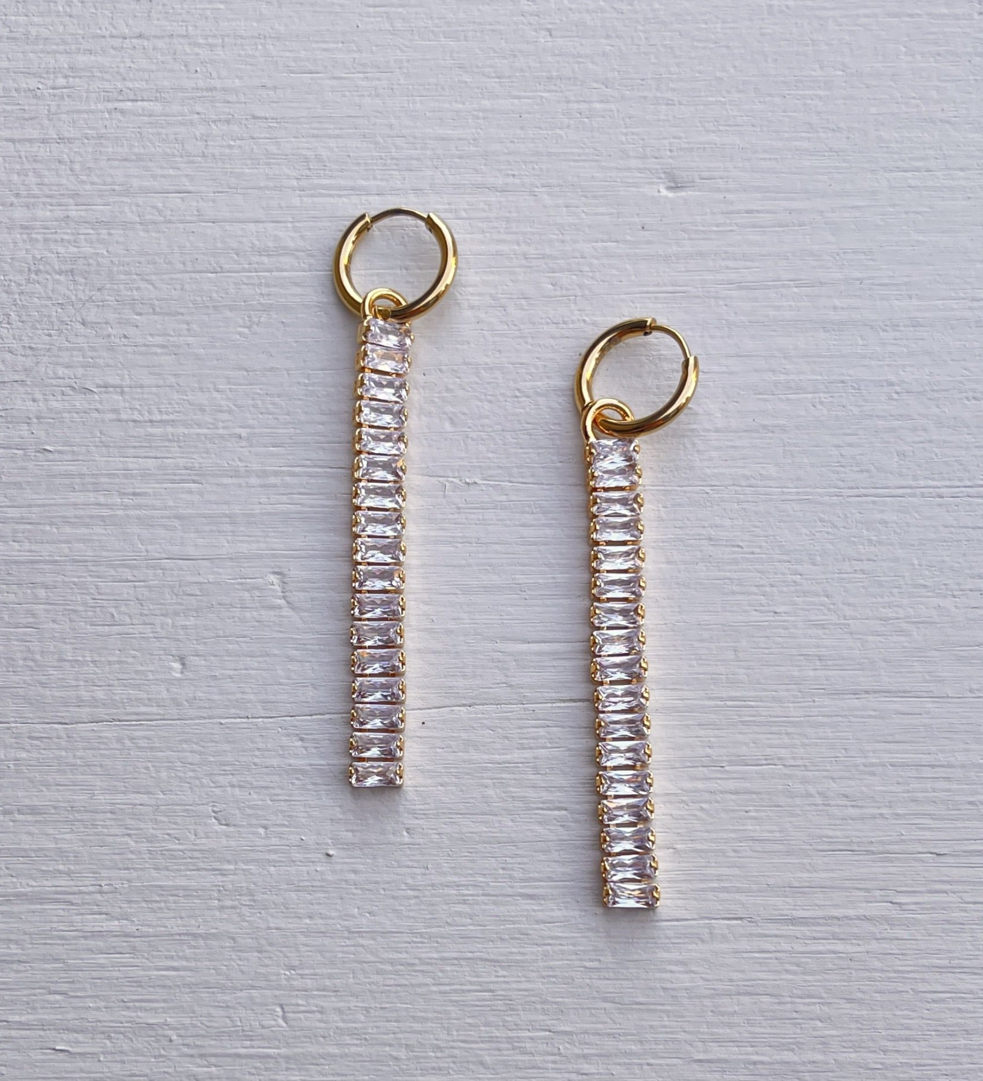 Gold Plated Crystal Baguette Long Drop Earrings on Huggie Hoops