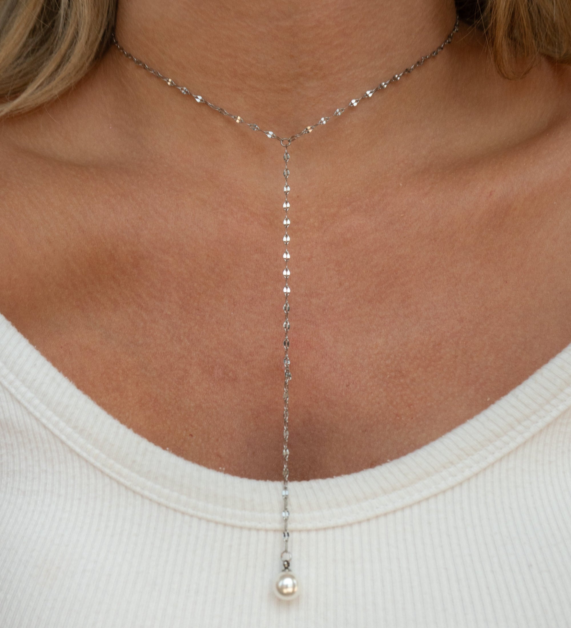 Silver Shimmer Y Chain Lariat Necklace with Pearl Drop