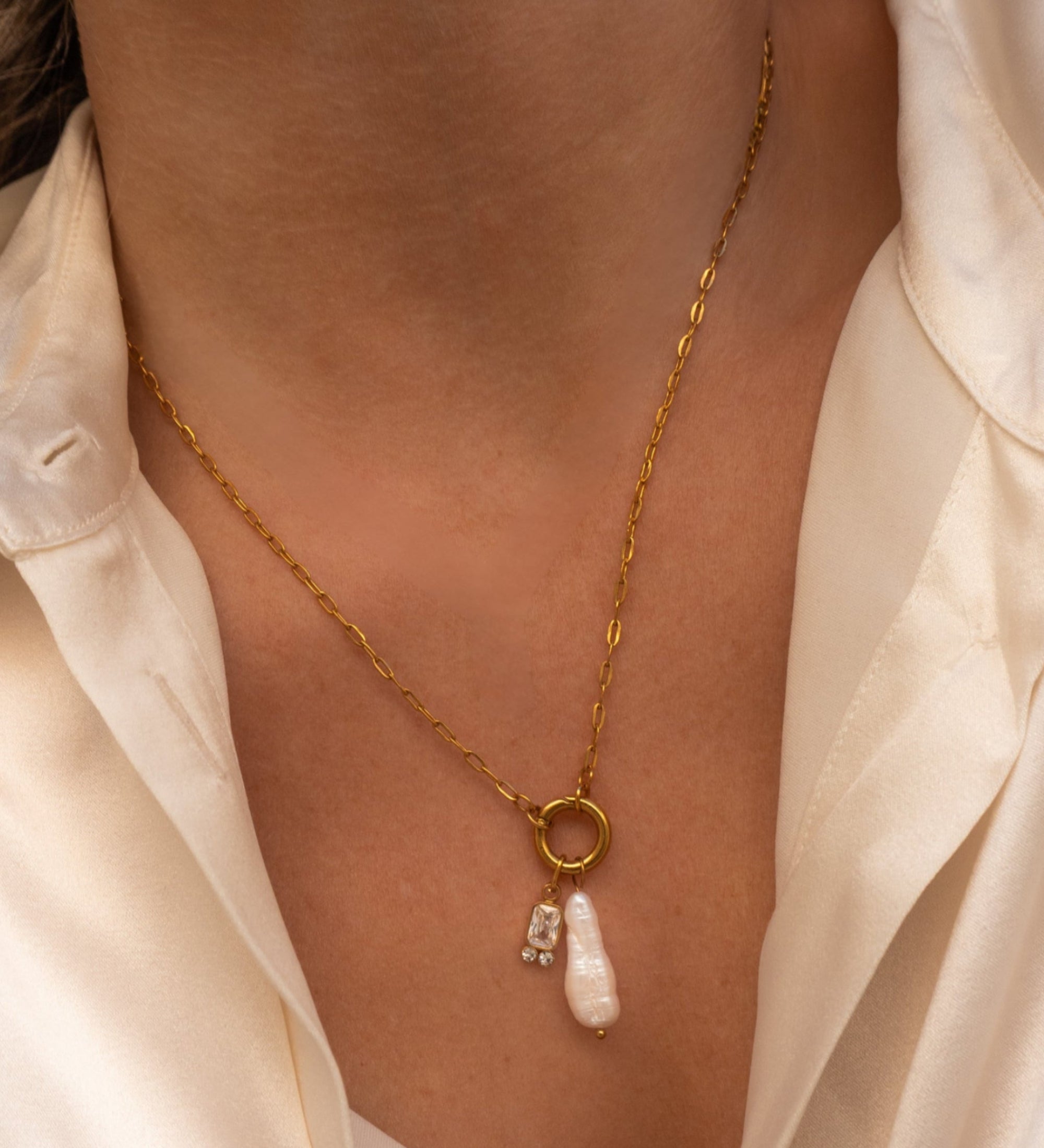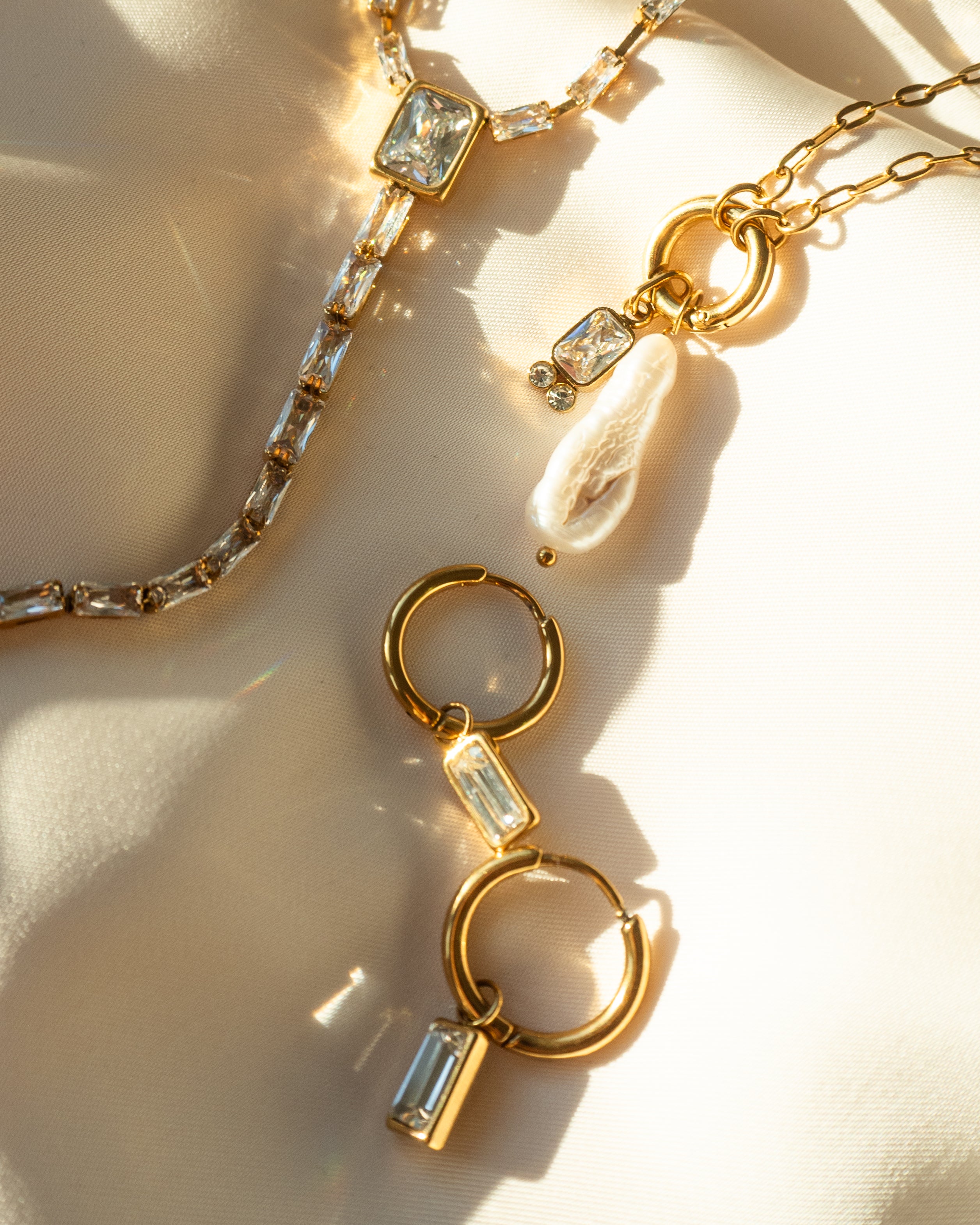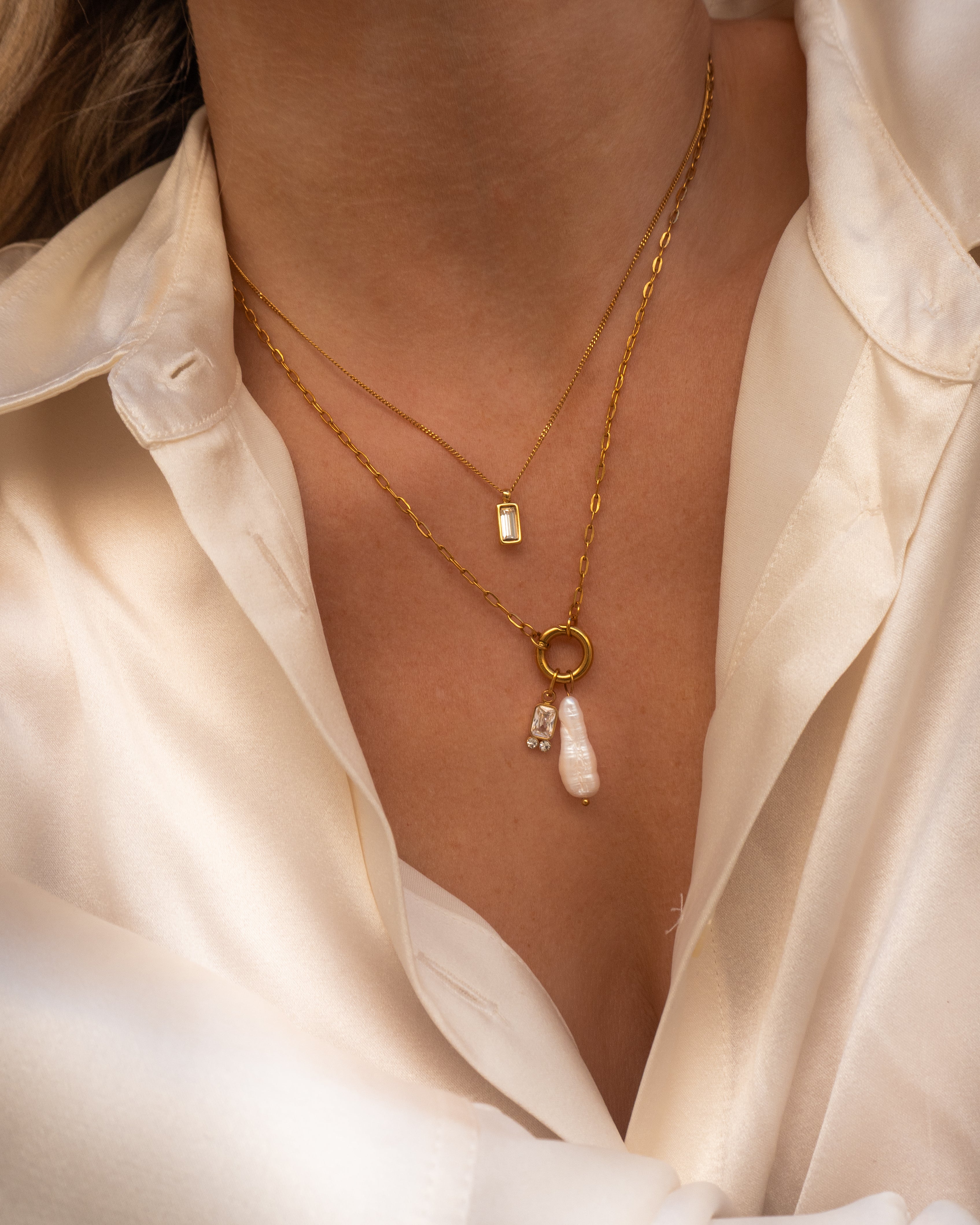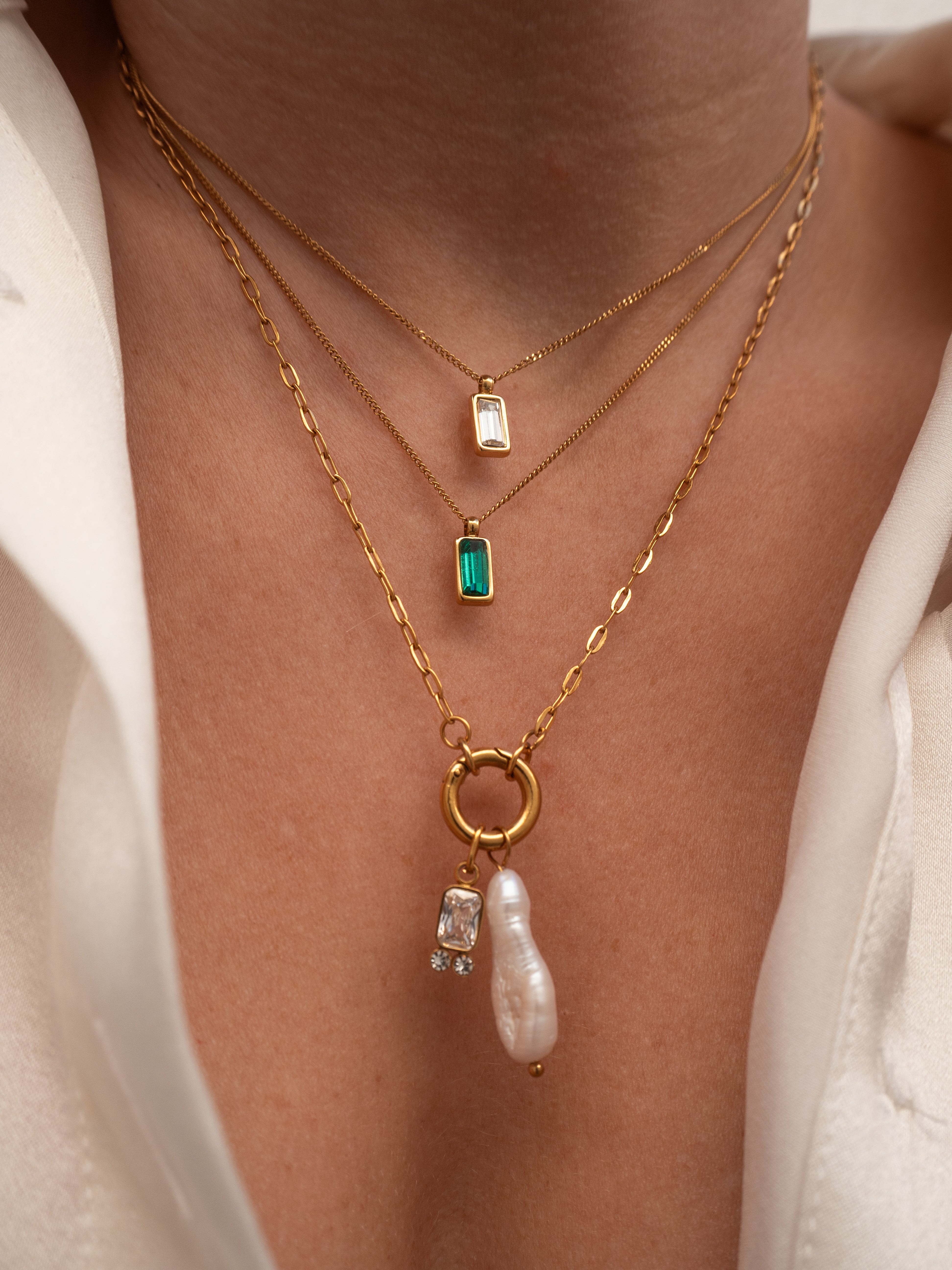 Gold Link Chain Necklace with Pearl and Crystal Baguette Charms