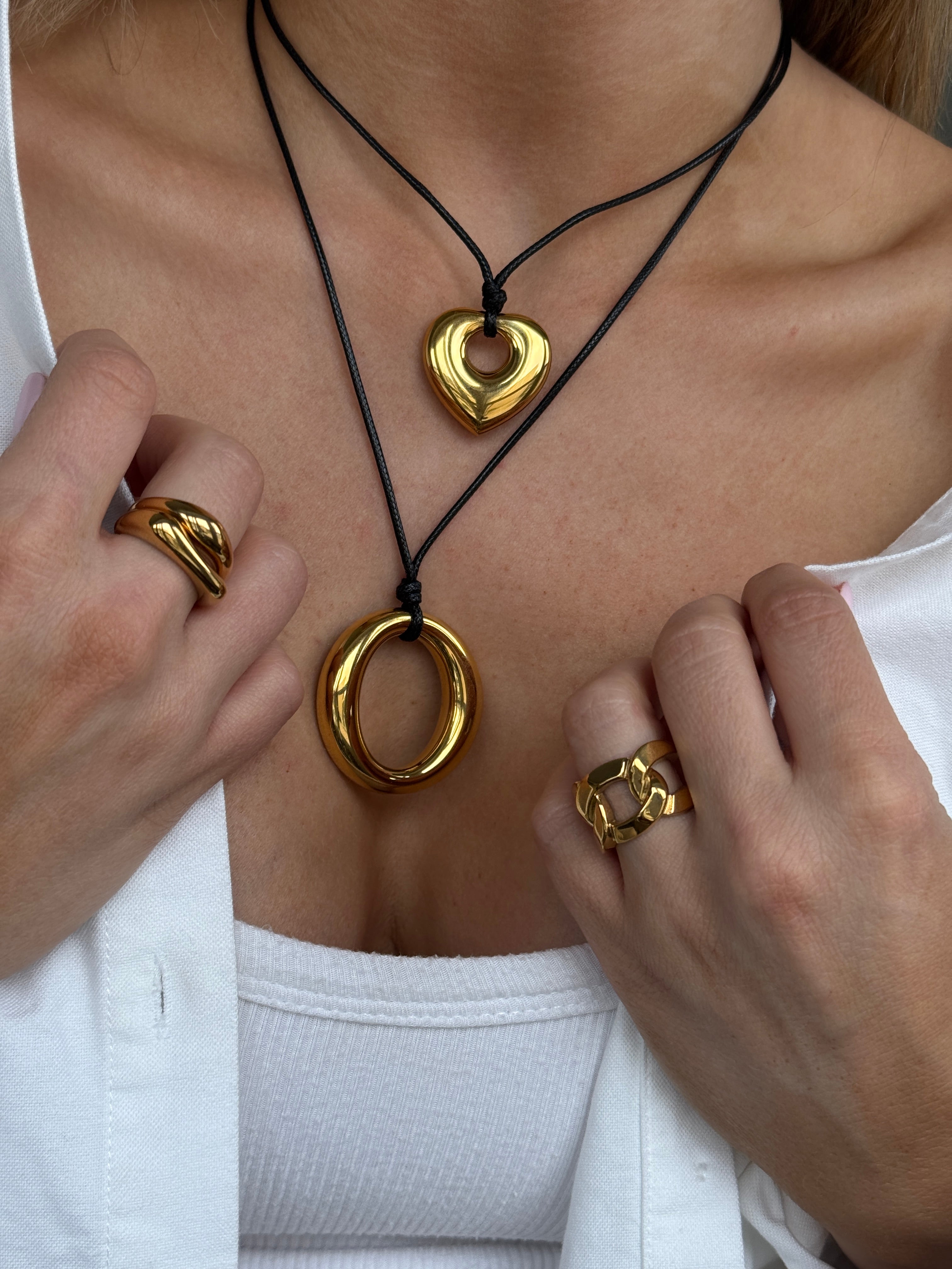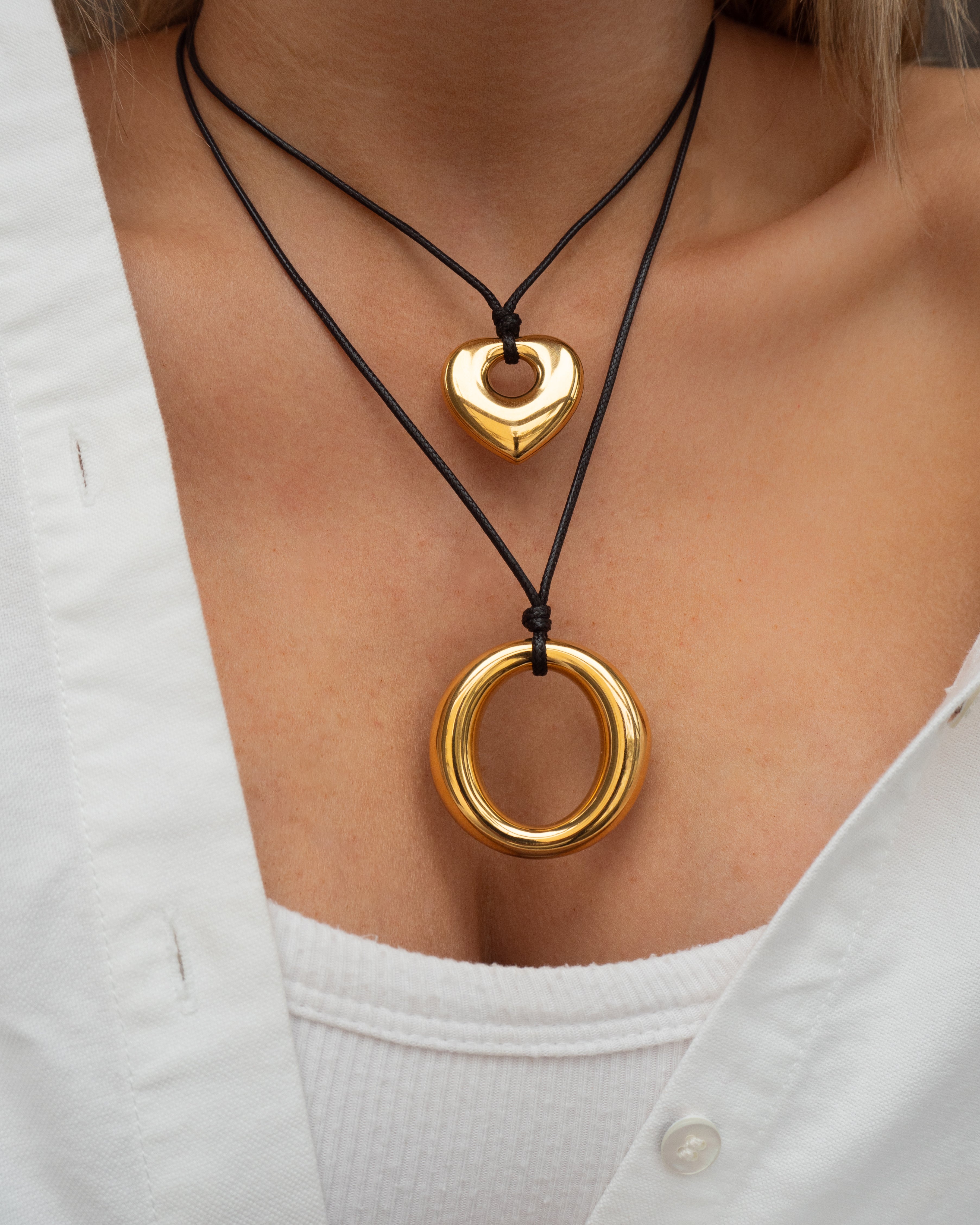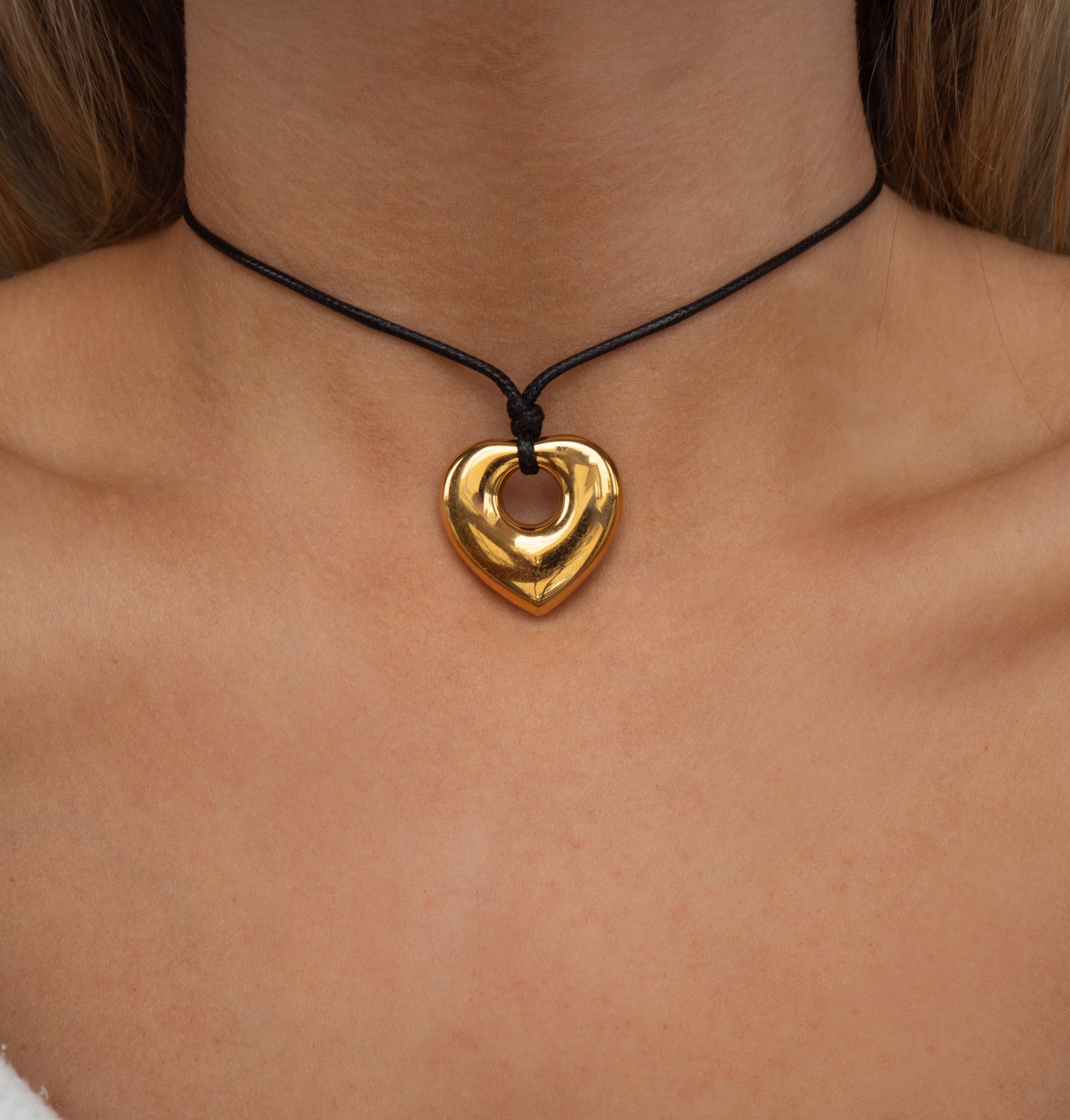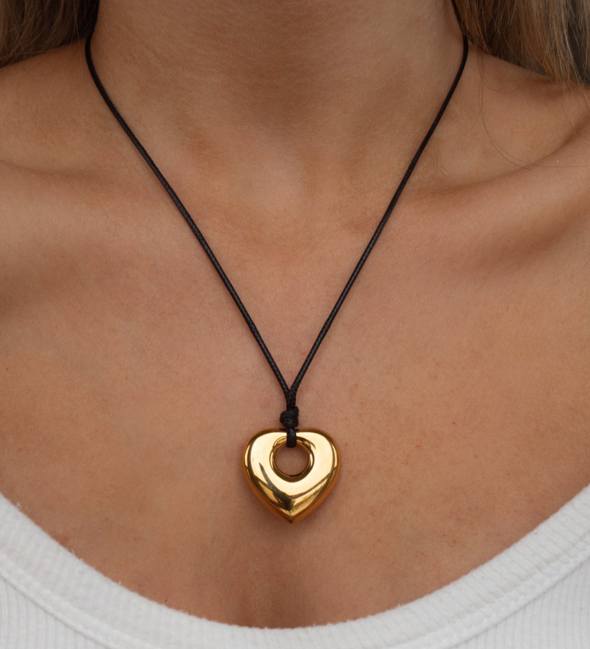 Gold Open Heart Pendant on Faux Black Leather Necklace